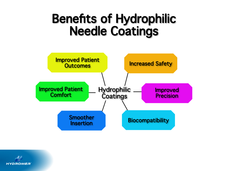- On the other hand, hydrophilic coatings attract water molecules and form a lubricious surface. They are used across a wide range of medical applications, including needles. Hydromer® medical coatings promote ease of insertion, reduce trauma, and help avoid tissue buildup. These properties are important with devices such as catheters, guidewires, and injection needles that are inserted inside the body.